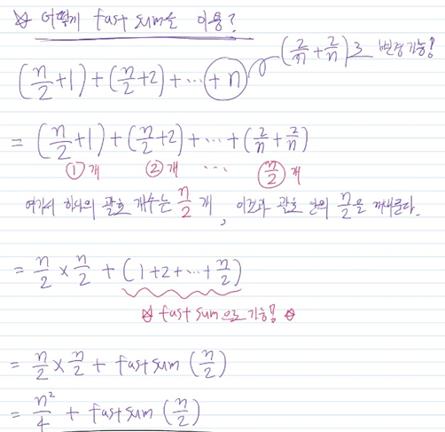 이 앞부분은 앞의 fastSum으로 해결할수있다. fastSum(n / 2)