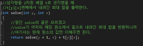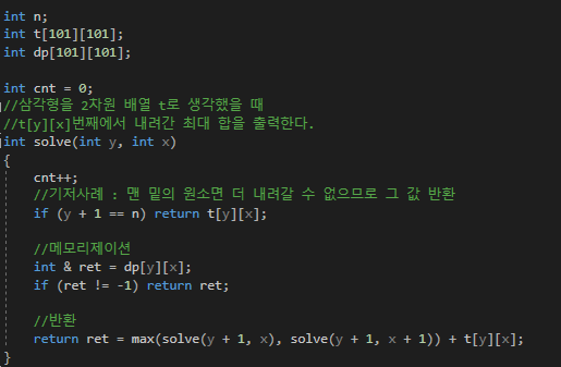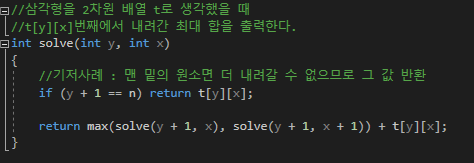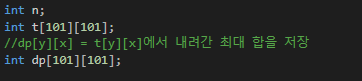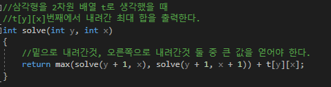 내려가는 방향은 바로 아래와 그 한칸 오른쪽으로 내려갈 수 있으며