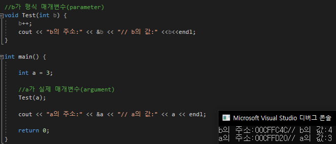 함수의 정의에 있는 int b [ ]는 호출 될 때 새로 생성되었으며 a와 가르키는 배열의 데이터는 같다
