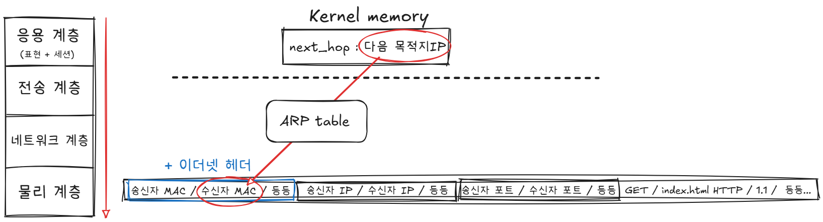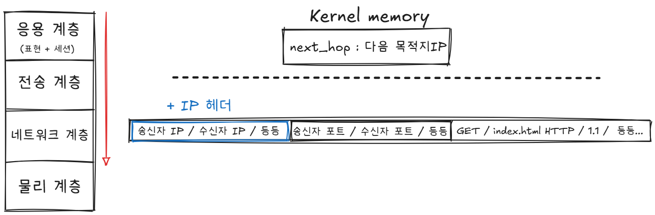 바로 네트워크 계층에서 커널 메모리 공간 어딘가에 next_hop을 일시적으로 저장하고,