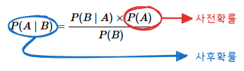 $$P(\text{사과}\mid\text{빨간 과일})=\dfrac{P(\text{빨간 과일}\mid\text{사과})\times P(\text{사과})}{P(\text{빨간 과일})}$$