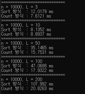 L이 작으면 큰 차이는 없지만, L이 커질수록 Count 방식이 훨씬 빠른 경향을 보이는 걸 알 수 있었다